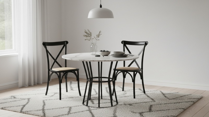 Las mesas circulares eliminan esquinas que obstaculizan el paso. Combinarlas con sillas sin apoyabrazos, como la Silla Crossback Madera y Rattan Negra, permite acercarlas completamente a la cubierta y guardarlas de forma compacta. El respaldo en X de esta silla aporta elegancia clásica sin añadir volumen extra.