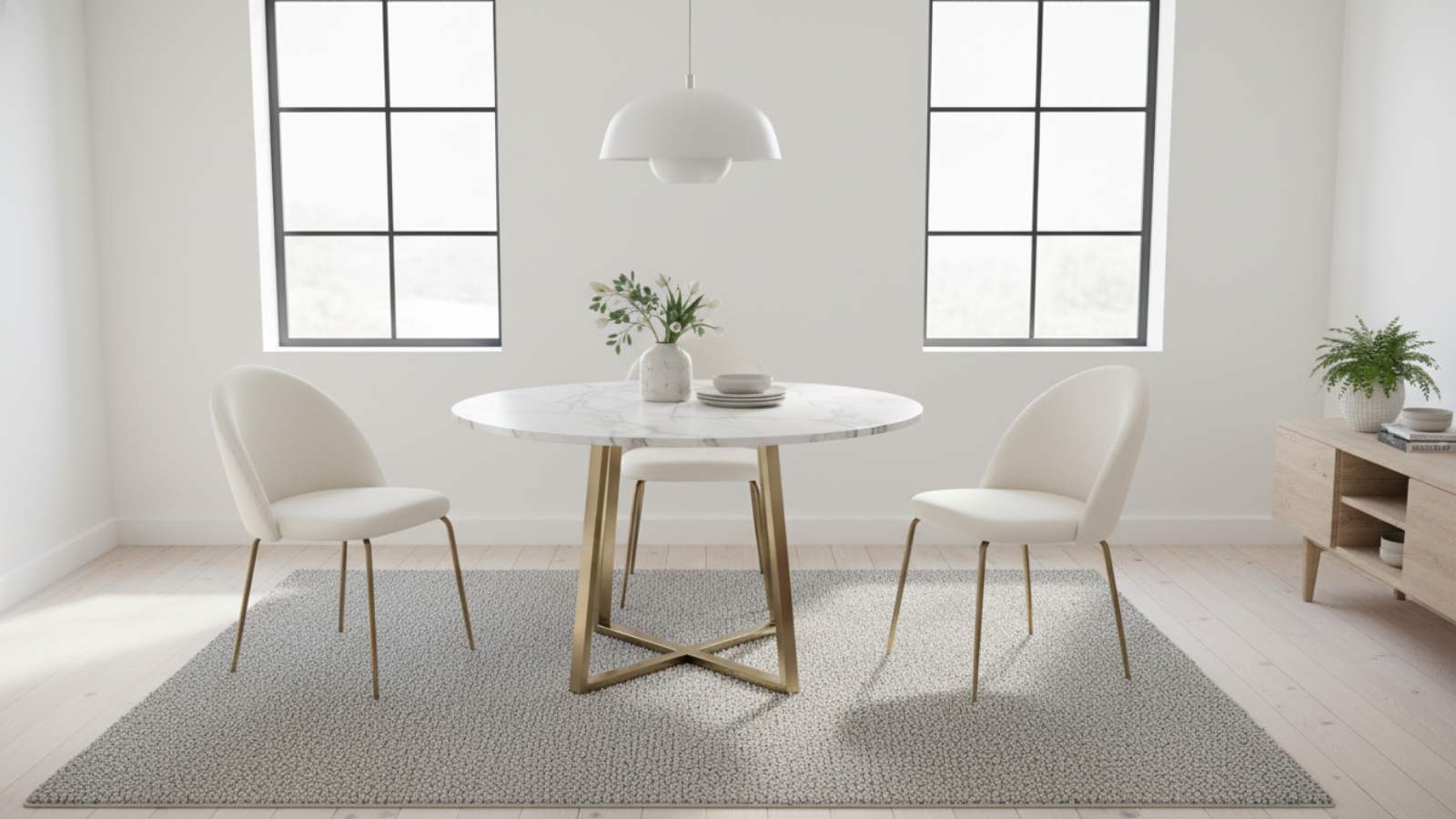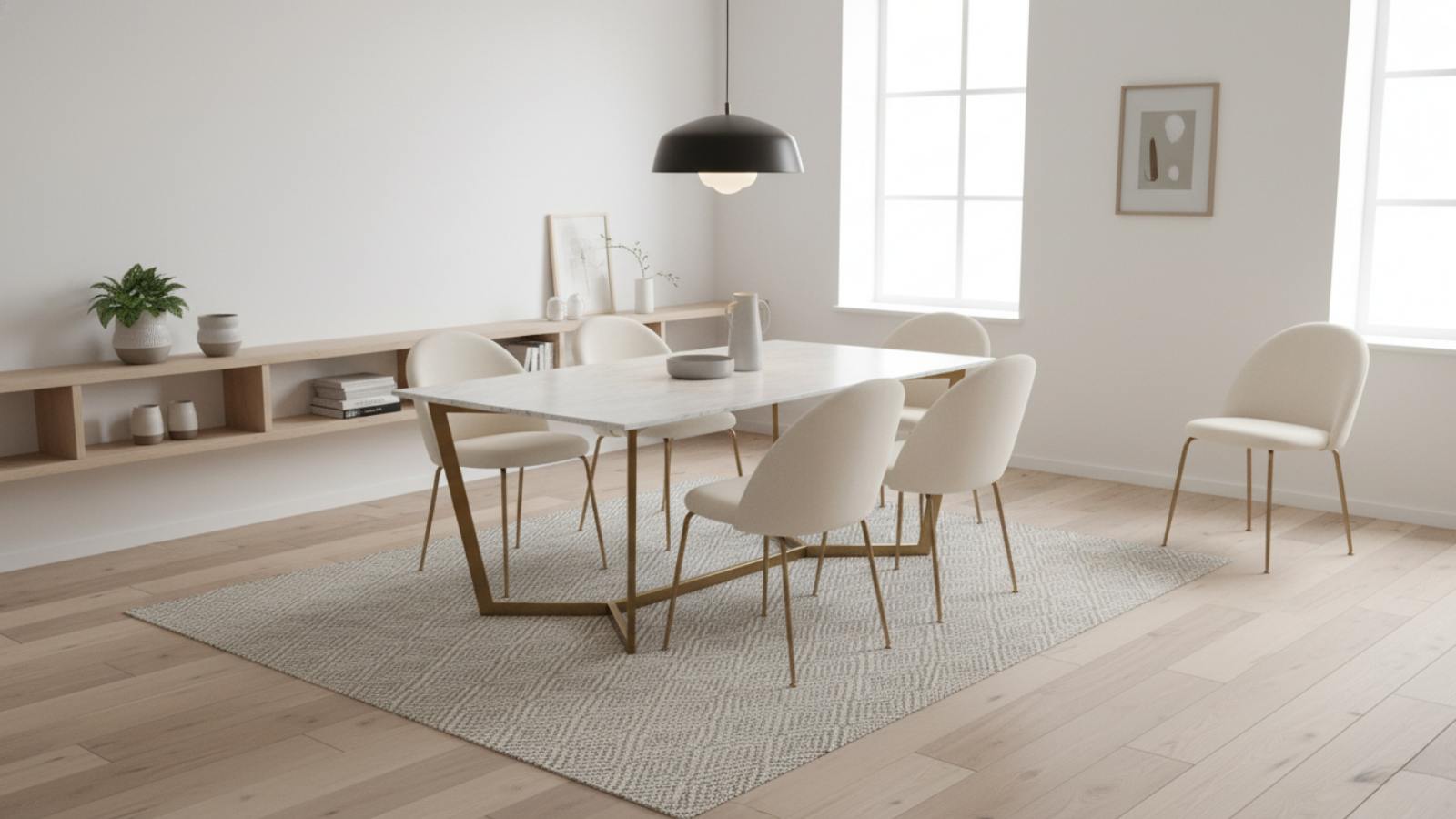 Las sillas nórdicas de líneas simples son ideales: respaldos rectos sin adornos, patas de madera natural o metal delgado, y tapizado en tonos neutros. Evita sillas con brazos complejos o tejidos llamativos. Nordeco ofrece varias opciones de sillas que complementan perfectamente la elegancia sutil de una mesa de mármol.