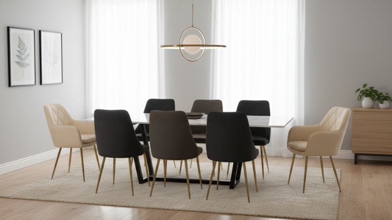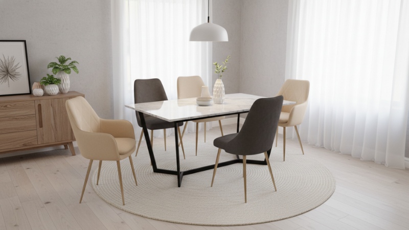 Mezclar modelos de sillas es una tendencia decorativa que aporta personalidad al comedor. Lo importante es mantener la misma altura de asiento (aproximadamente 45 cm) para que todos los comensales queden a la misma distancia de la superficie. Las sillas nórdicas de Nordeco comparten esta medida estándar, permitiendo combinaciones armoniosas.