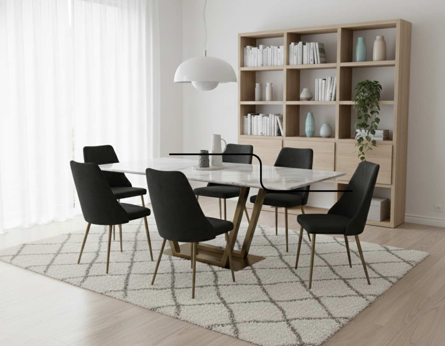 Esta medida permite acomodar entre 4 y 6 personas dependiendo de la forma de la mesa y el tipo de sillas que selecciones. Las líneas limpias del diseño escandinavo favorecen esta distribución, creando ambientes donde cada comensal disfruta del espacio necesario para una experiencia agradable.