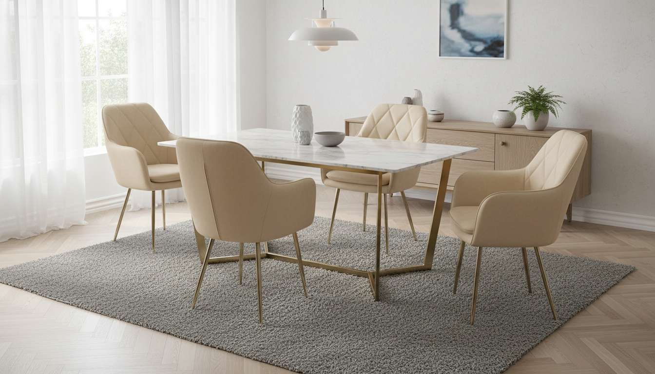 El velvet sintético es más resistente a la decoloración por luz solar directa. Si tu comedor tiene ventanas grandes o recibe mucho sol durante el día, el velvet es la opción más segura a largo plazo. Las sillas Skadi Velvet y Voss Velvet Beige son ejemplos de cómo este material se ve en un comedor nórdico real: elegantes, con caída limpia y colores estables en el tiempo.
