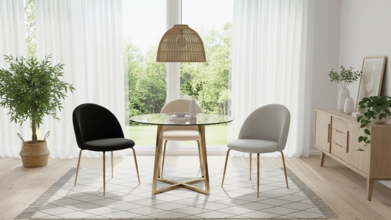 Para complementar tu comedor, las sillas estilo nórdico ofrecen asientos esculpidos en madera terciada con espuma de alta densidad, garantizando confort durante largas sobremesas. Sus patas metálicas en acabados dorado o negro añaden un toque de distinción contemporánea.